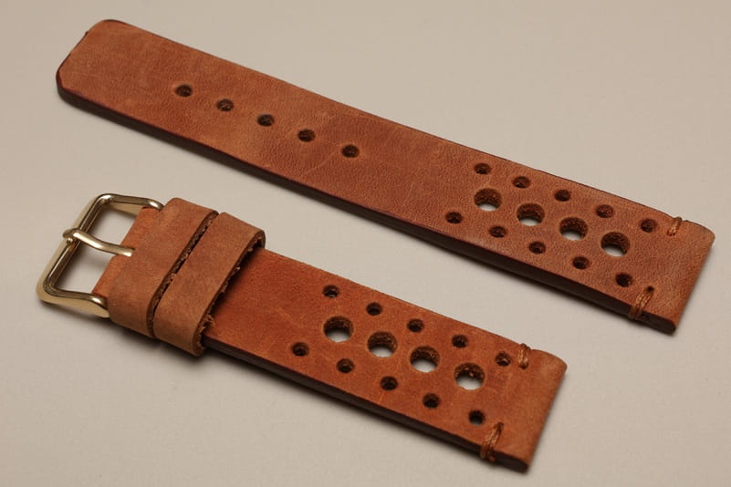 Pasek w stylu vintage z jednego kawałka skóry, klejony, gładki. Miękki, wykończenie matowe. Charakterystyczne dla modelu Tropic otwory w pasku, cztery większe otwory przez środek, po bokach symetrycznie po pięć mniejszych. Fason równoległy, koniec paska równo ścięty. Dwie ruchome szlufki, stalowa klamerka. Na końcach paska i przy klamerce ozdobne przeszycia pod kolor.