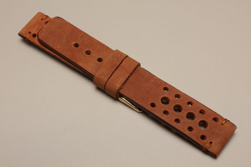 Pasek w stylu vintage z jednego kawałka skóry, klejony, gładki. Miękki, wykończenie matowe. Charakterystyczne dla modelu Tropic otwory w pasku, cztery większe otwory przez środek, po bokach symetrycznie po pięć mniejszych. Fason równoległy, koniec paska równo ścięty. Dwie ruchome szlufki, stalowa klamerka. Na końcach paska i przy klamerce ozdobne przeszycia pod kolor.