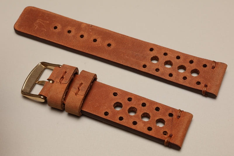 Pasek w stylu vintage z jednego kawałka skóry, klejony, gładki. Miękki, wykończenie matowe. Charakterystyczne dla modelu Tropic otwory w pasku, cztery większe otwory przez środek, po bokach symetrycznie po pięć mniejszych. Fason równoległy, dwie ruchome szlufki, stalowa klamerka. Na końcach paska i przy klamerce ozdobne przeszycia pod kolor.