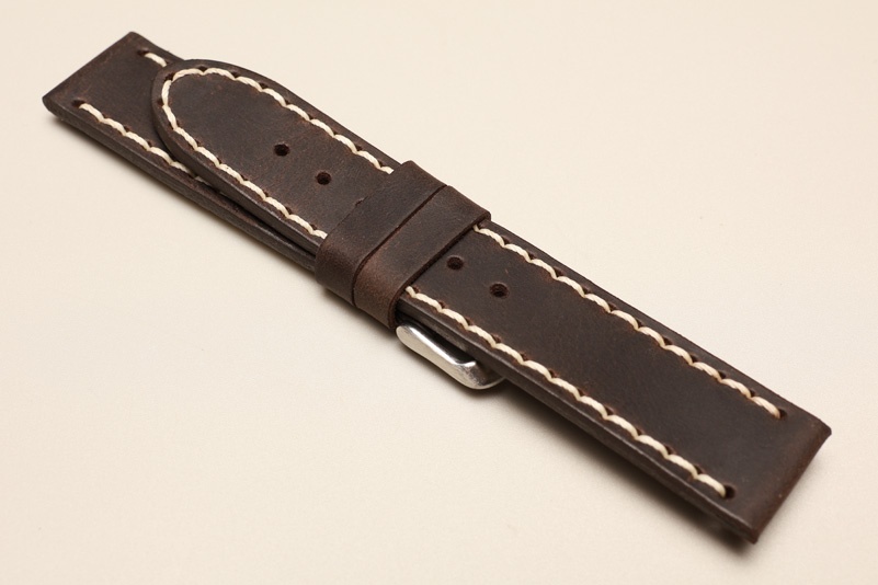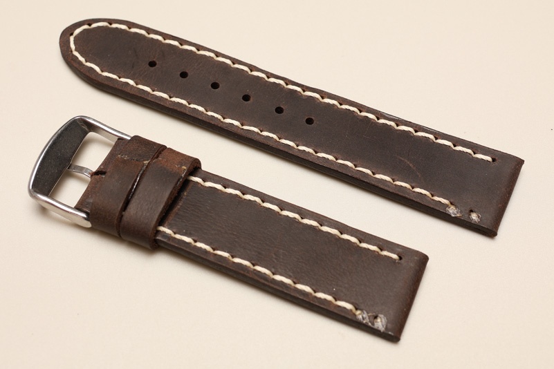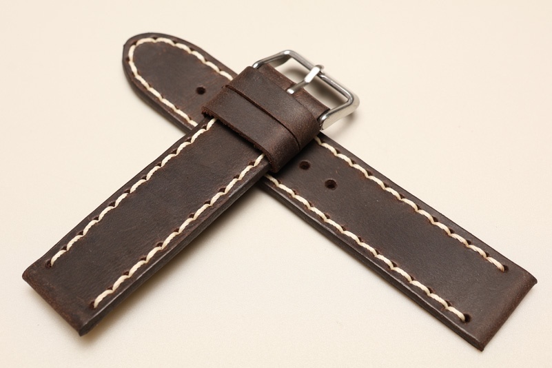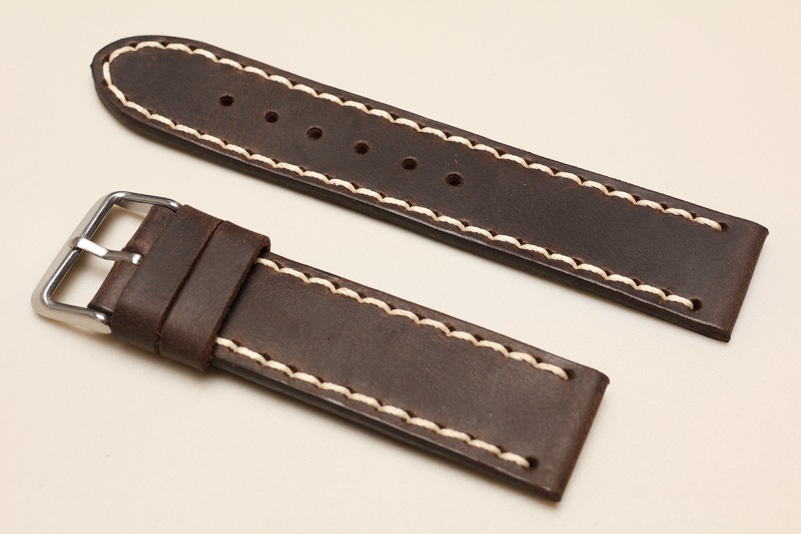 Pasek z jednego kawałka skóry, klejony, gładki. Równoległy fason w stylu vintage, z kolorowymi przeszyciami: na całej długości paska oraz przy klamerce.