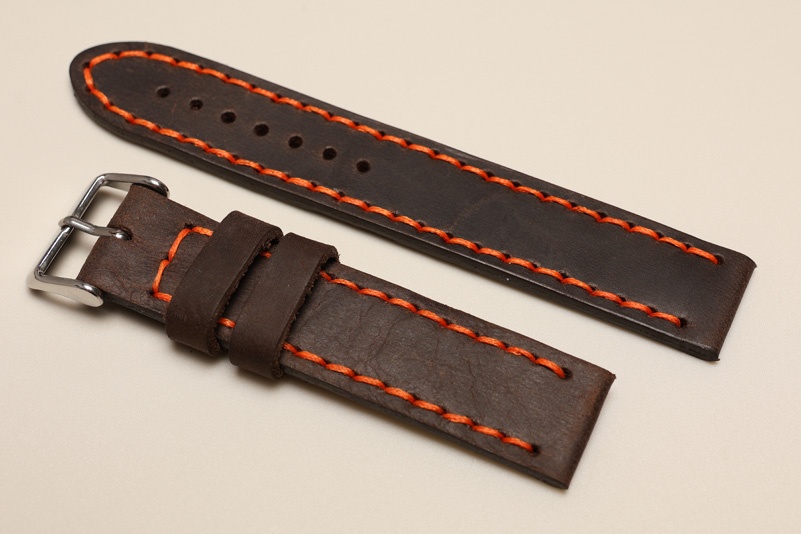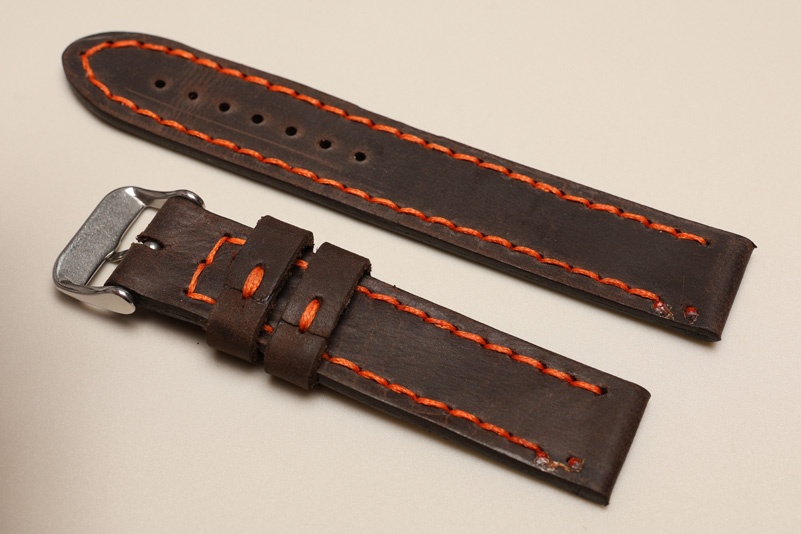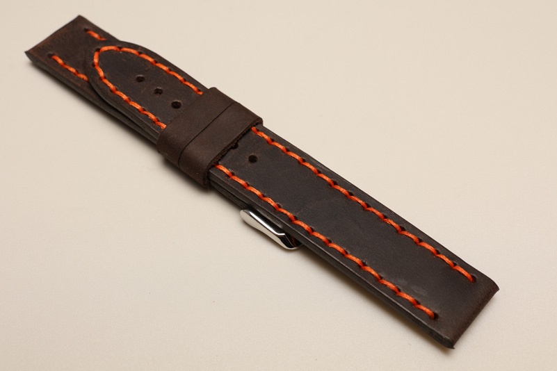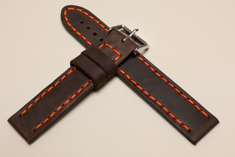 Pasek z jednego kawałka skóry, klejony, gładki. Równoległy fason w stylu vintage, z kolorowymi przeszyciami: na całej długości paska oraz przy klamerce.