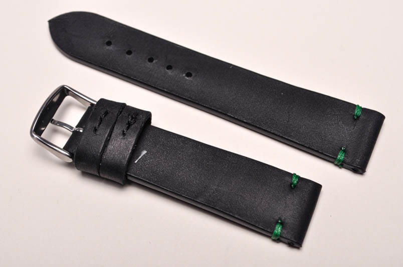 Pasek z jednego kawałka skóry, klejony, gładki, zwężany przy klamerce. Styl vintage, z delikatnymi, kolorowymi przeszyciami: przy mocowaniu do zegarka i przy zapięciu. Miękki, wykończenie matowe. Dwie ruchome szlufki, stalowa klamerka.