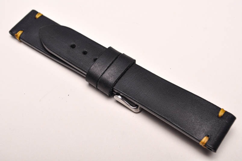 Pasek z jednego kawałka skóry, klejony, gładki, zwężany przy klamerce. Styl vintage, z delikatnymi, kolorowymi przeszyciami: przy mocowaniu do zegarka i przy zapięciu. Miękki, wykończenie matowe. Dwie ruchome szlufki, stalowa klamerka.