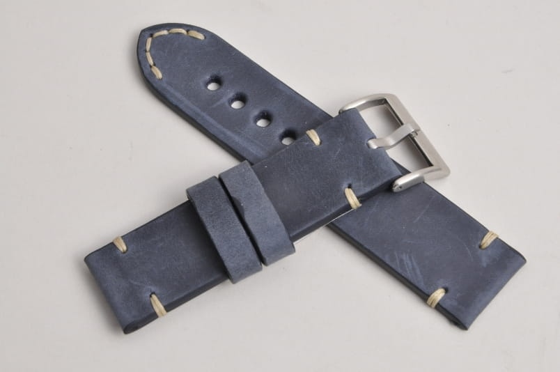 Pasek z jednego kawałka skóry, klejony, gładki. Równoległy fason w stylu vintage, z kolorowymi przeszyciami: przy mocowaniu do zegarka, przy klamerce oraz na końcu części z dziurkami. Miękki, wykończenie matowe. Dwie ruchome szlufki, masywna stalowa klamerka.
