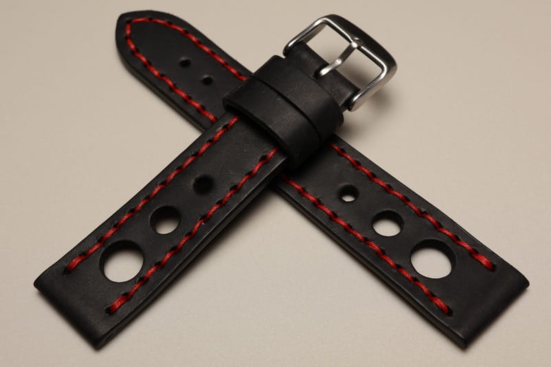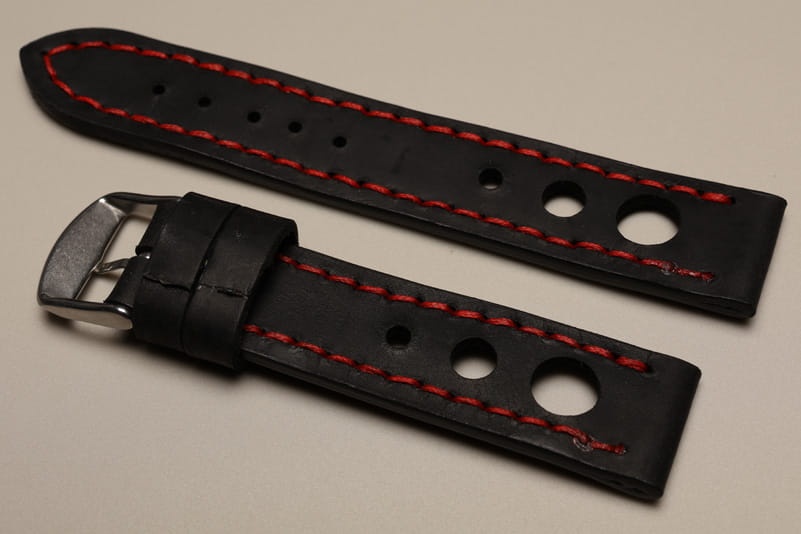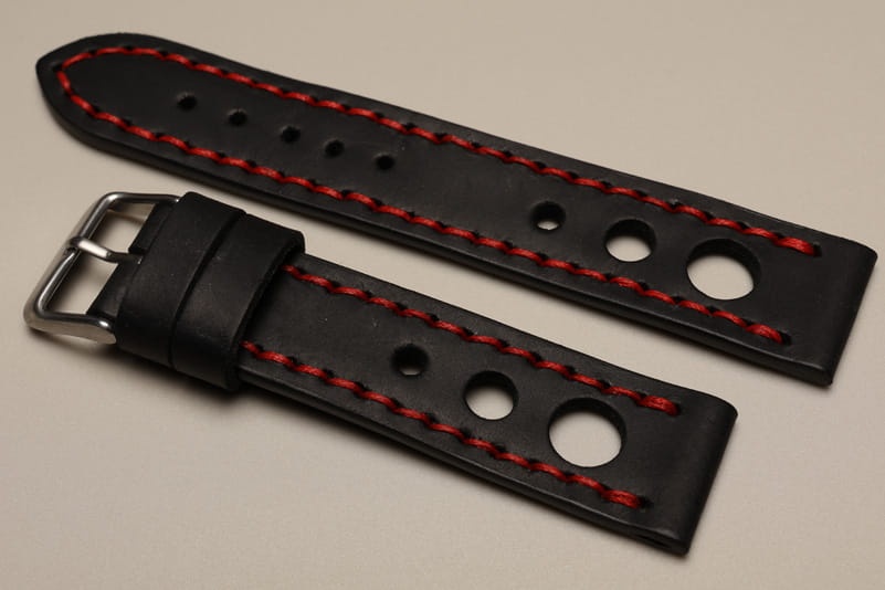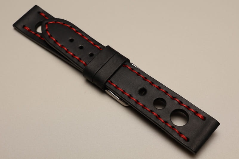 Pasek z jednego kawałka skóry, klejony, gładki. Fason Rally, charakterystyczne trzy otwory w pasku, kolorowe przeszycie na całej długości paska oraz przy klamerce. Miękki, wykończenie matowe. Dwie szlufki, stalowa klamerka.