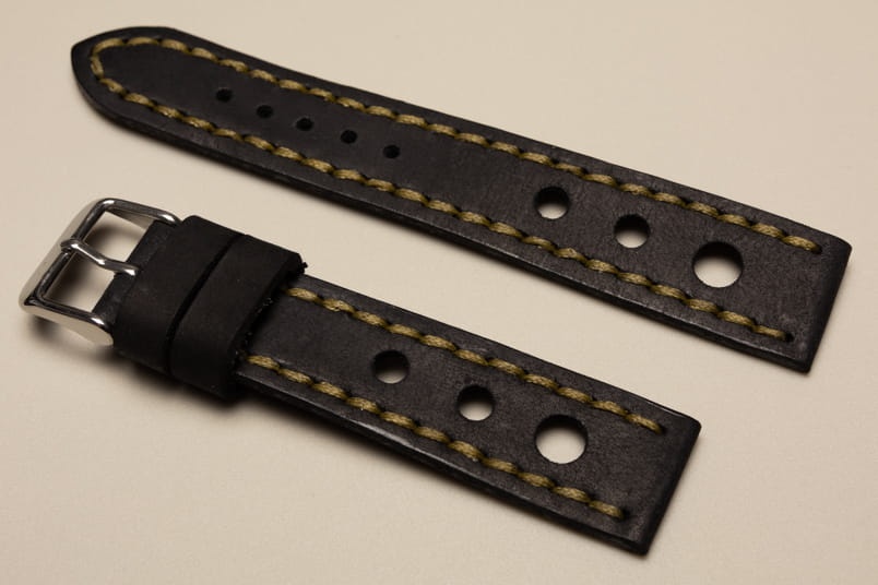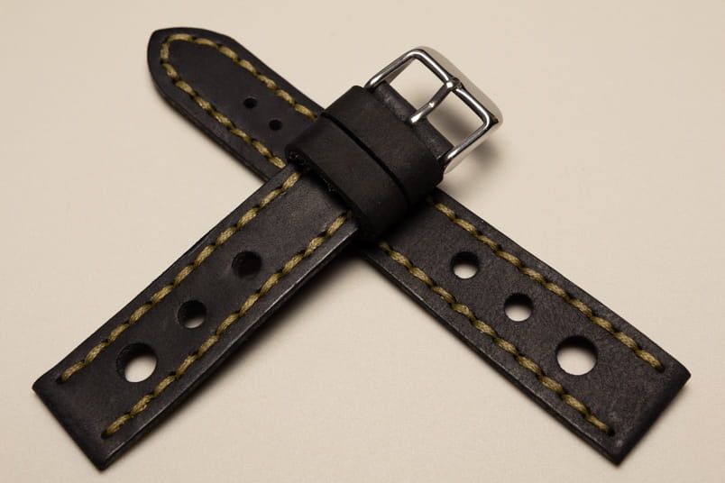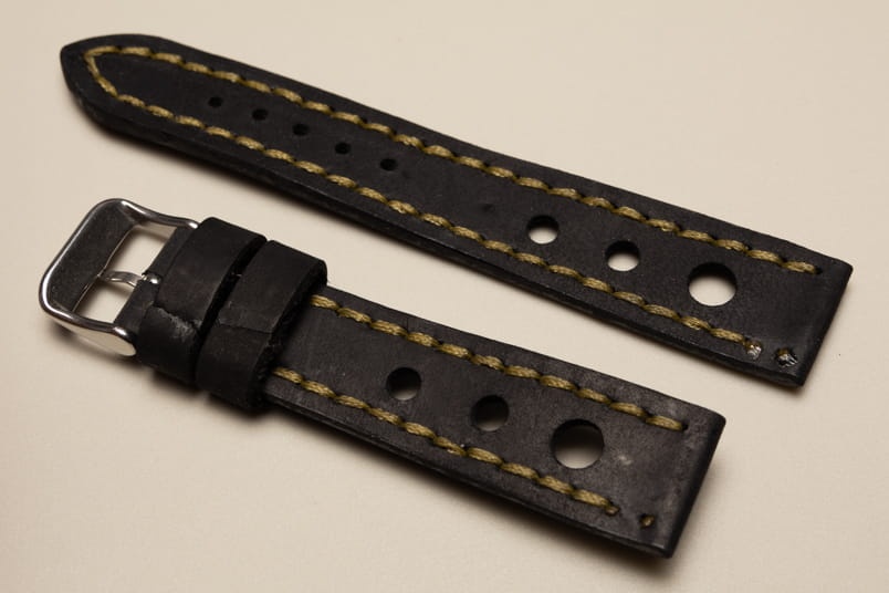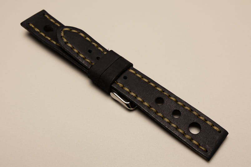 Pasek z jednego kawałka skóry, klejony, gładki. Fason Rally, charakterystyczne trzy otwory w pasku, kolorowe przeszycie na całej długości paska oraz przy klamerce. Miękki, wykończenie matowe. Dwie szlufki, stalowa klamerka.