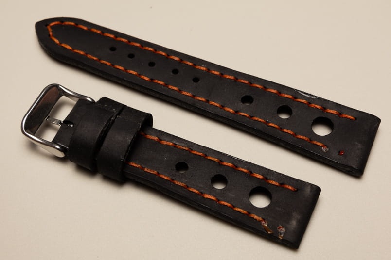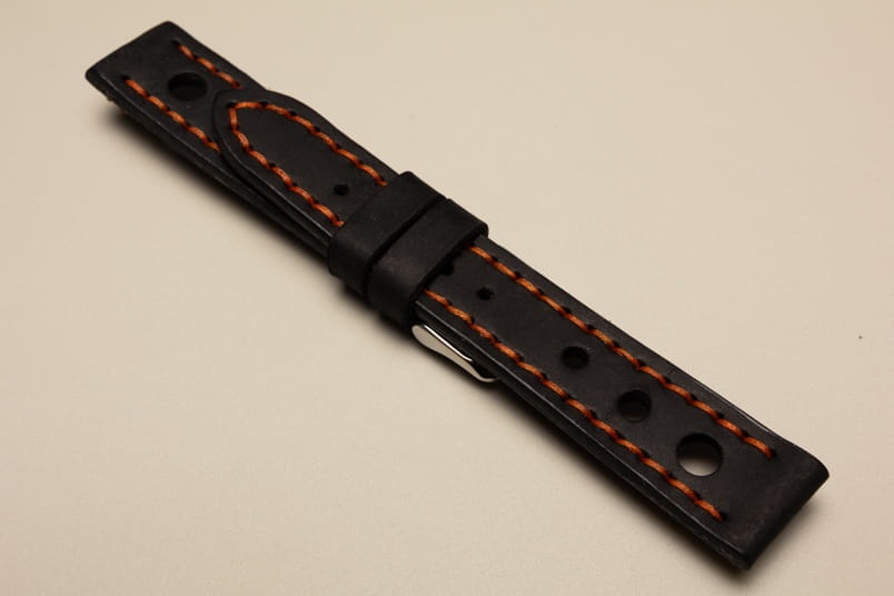 Pasek z jednego kawałka skóry, klejony, gładki. Fason Rally, charakterystyczne trzy otwory w pasku, kolorowe przeszycie na całej długości paska oraz przy klamerce. Miękki, wykończenie matowe. Dwie szlufki, stalowa klamerka.