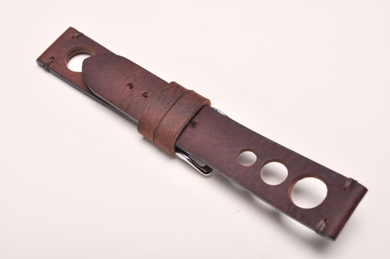 Pasek z jednego kawałka skóry, klejony, gładki. Wzór Rally, charakterystyczne trzy otwory w pasku, o średnicy 13/10/7mm dodatkowo kolorowe przeszycie od strony teleskopów oraz przy klamerce. Miękki, wykończenie matowe. Dwie szlufki, stalowa klamerka.