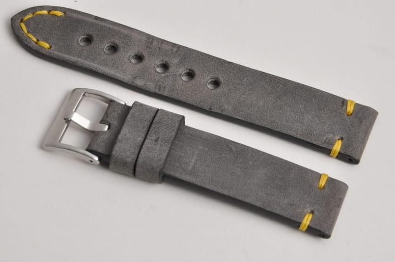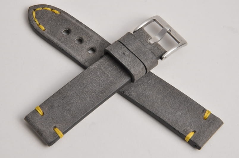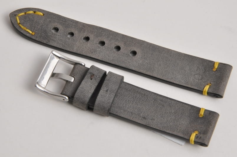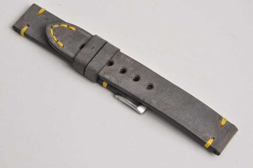 Pasek z jednego kawałka skóry, klejony, gładki. Równoległy fason w stylu vintage, z kolorowymi przeszyciami: przy mocowaniu do zegarka, przy klamerce oraz na końcu części z dziurkami. Miękki, wykończenie matowe. Dwie ruchome szlufki, masywna stalowa klamerka.