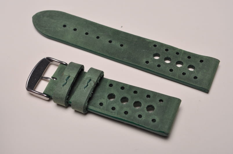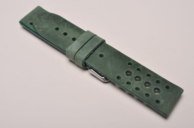Pasek w stylu vintage z jednego kawałka skóry, klejony, gładki. Miękki, wykończenie matowe. Charakterystyczne dla modelu Tropic otwory w pasku, cztery większe otwory przez środek, po bokach symetrycznie po pięć mniejszych. Fason równoległy, koniec paska równo ścięty. Dwie ruchome szlufki, stalowa klamerka.