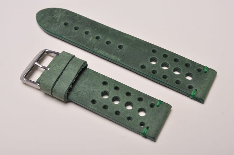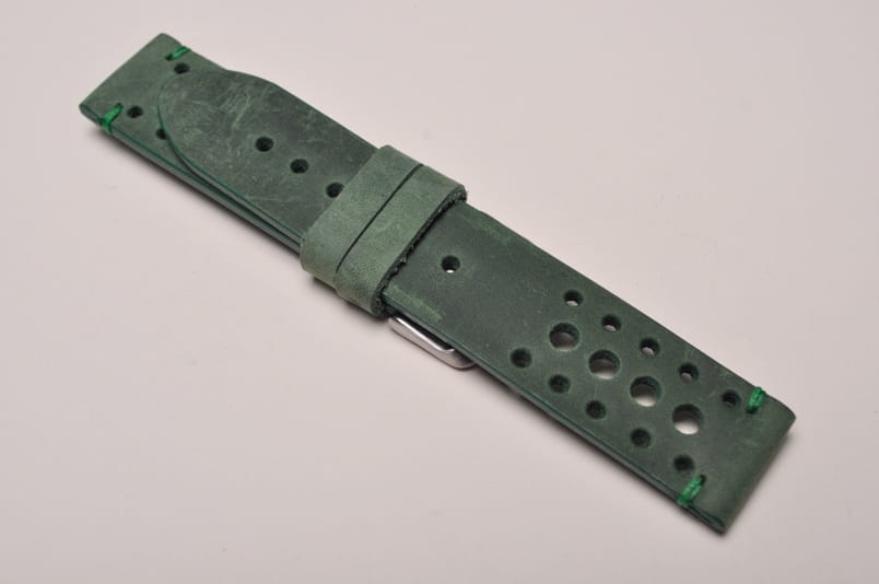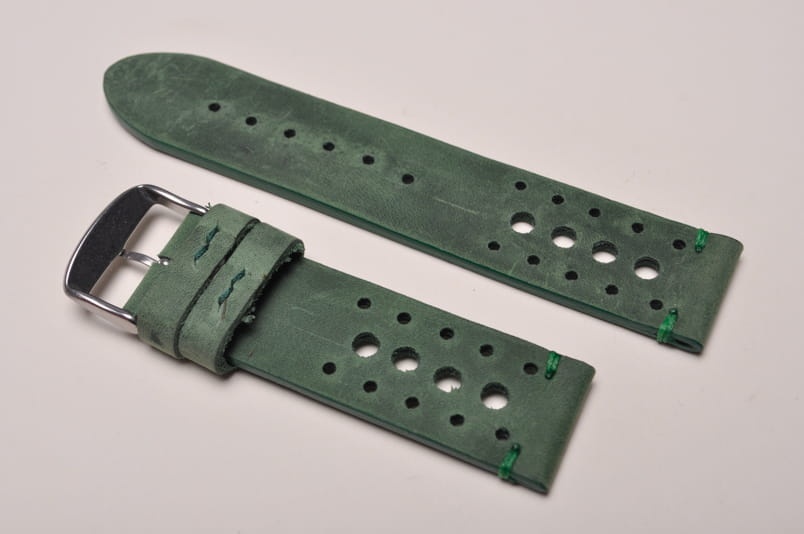Pasek w stylu vintage z jednego kawałka skóry, klejony, gładki. Miękki, wykończenie matowe. Charakterystyczne dla modelu Tropic otwory w pasku, cztery większe otwory przez środek, po bokach symetrycznie po pięć mniejszych. Fason równoległy, koniec paska równo ścięty. Dwie ruchome szlufki, stalowa klamerka. Na końcach paska i przy klamerce ozdobne przeszycia pod kolor.