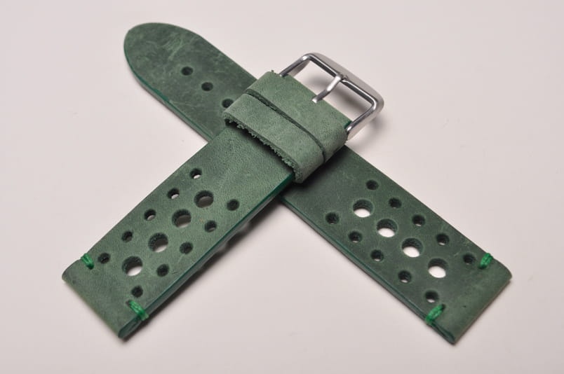 Pasek w stylu vintage z jednego kawałka skóry, klejony, gładki. Miękki, wykończenie matowe. Charakterystyczne dla modelu Tropic otwory w pasku, cztery większe otwory przez środek, po bokach symetrycznie po pięć mniejszych. Fason równoległy, dwie ruchome szlufki, stalowa klamerka. Na końcach paska i przy klamerce ozdobne przeszycia pod kolor.