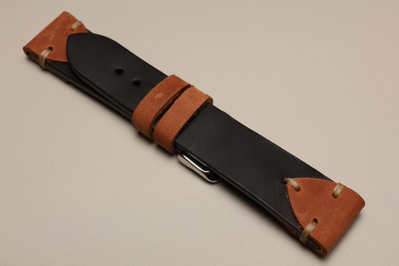 Pasek z jednego kawałka skóry, klejony, gładki. W stylu vintage, z kolorowymi przeszyciami. Od strony mocowania do zegarka ciekawie ozdobiony skórzanymi naszywkami w kolorze brązowym. Miękki, wykończenie matowe. Dwie, także brązowe, szlufki, masywna stalowa klamerka.