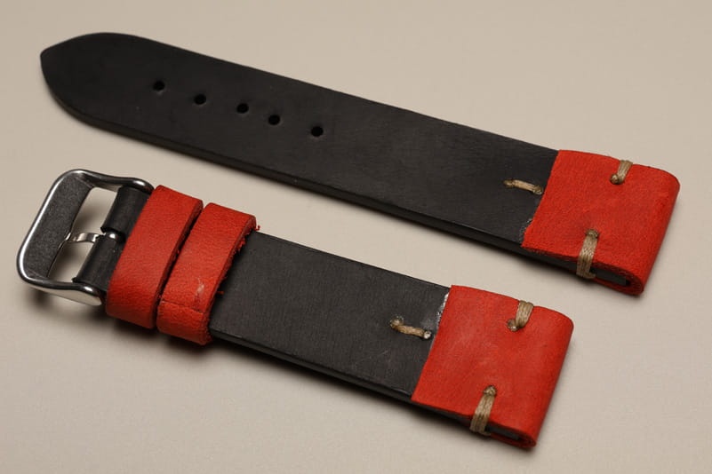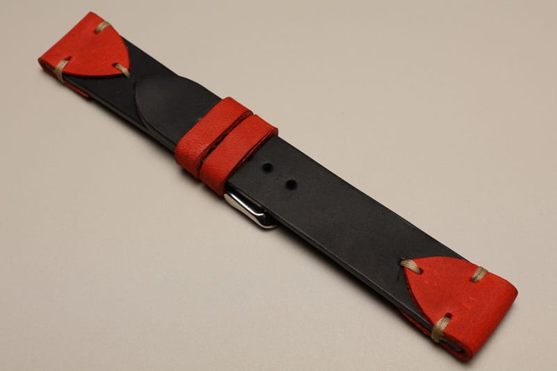Pasek z jednego kawałka skóry, klejony, gładki. W stylu vintage, z kolorowymi przeszyciami. Od strony mocowania do zegarka ciekawie ozdobiony skórzanymi naszywkami w kolorze czerwonym. Miękki, wykończenie matowe. Dwie, także czerwone, szlufki, masywna stalowa klamerka.