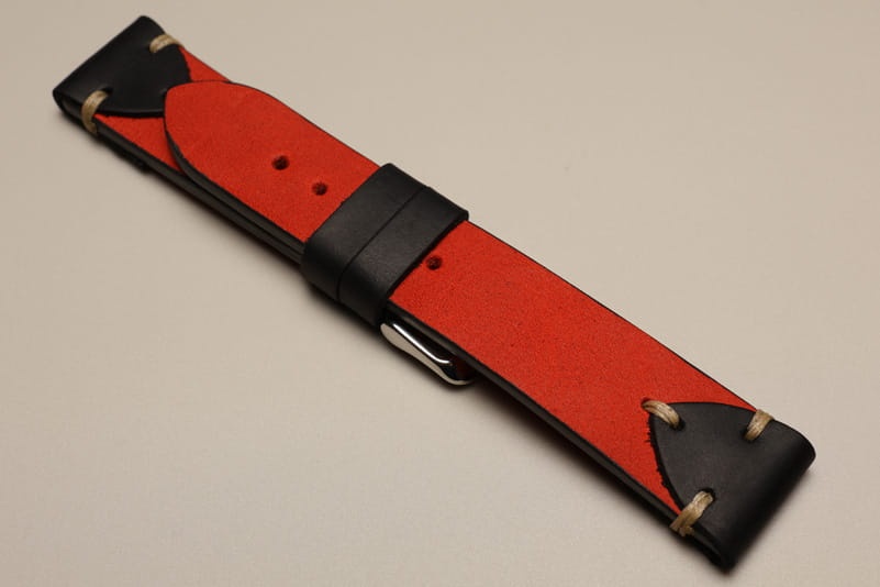 Pasek z jednego kawałka skóry, klejony, gładki. W stylu vintage, z kolorowymi przeszyciami. Od strony mocowania do zegarka ciekawie ozdobiony skórzanymi naszywkami w kolorze czarnym. Miękki, wykończenie matowe. Dwie, także czarne, szlufki, masywna stalowa klamerka.