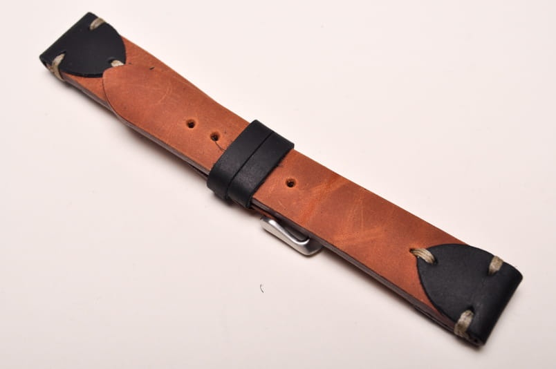 Pasek z jednego kawałka skóry, klejony, gładki. W stylu vintage, z kolorowymi przeszyciami. Od strony mocowania do zegarka ciekawie ozdobiony skórzanymi naszywkami w kolorze czarnym. Miękki, wykończenie matowe. Dwie, także czarne, szlufki, masywna stalowa klamerka.