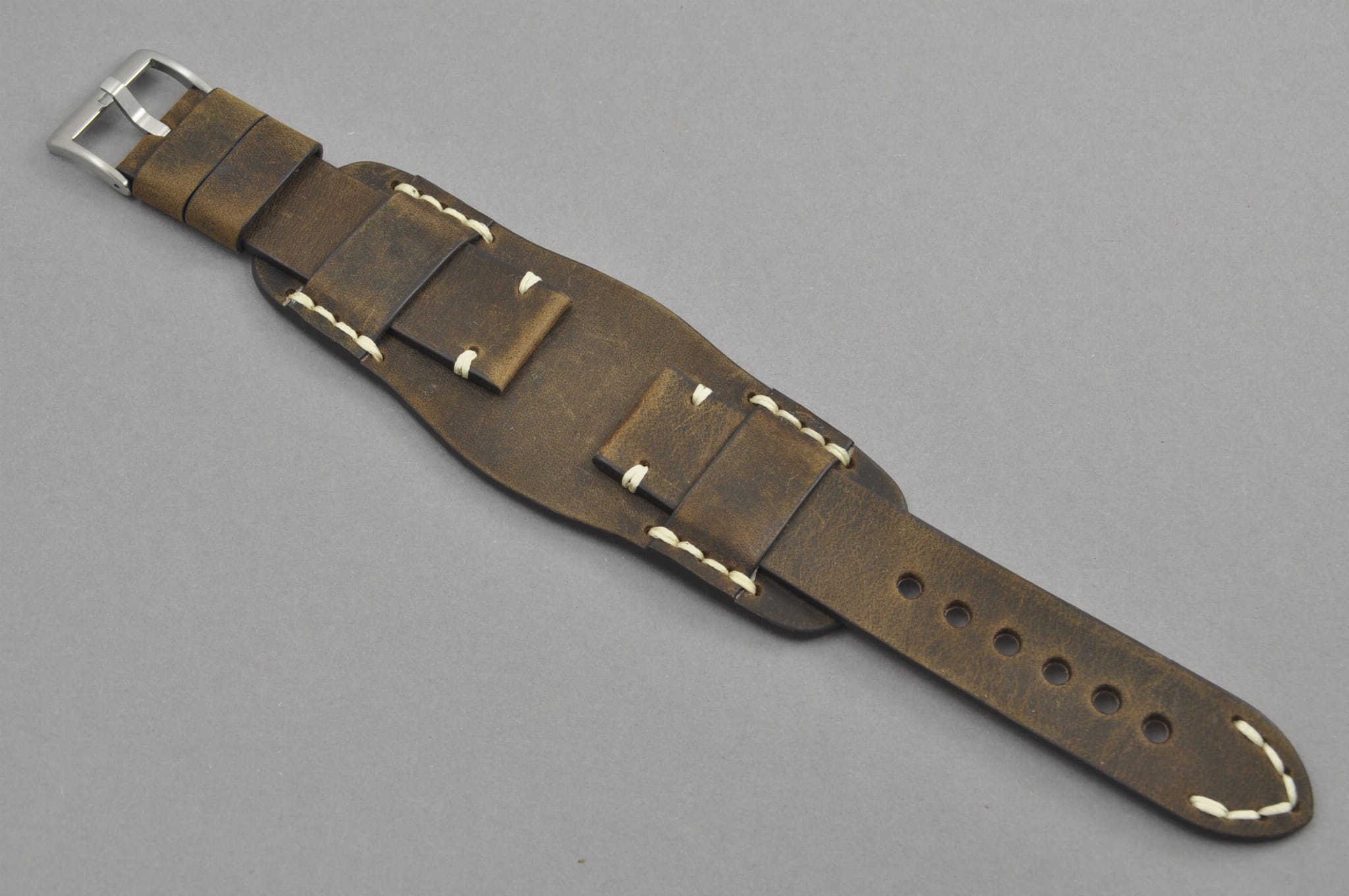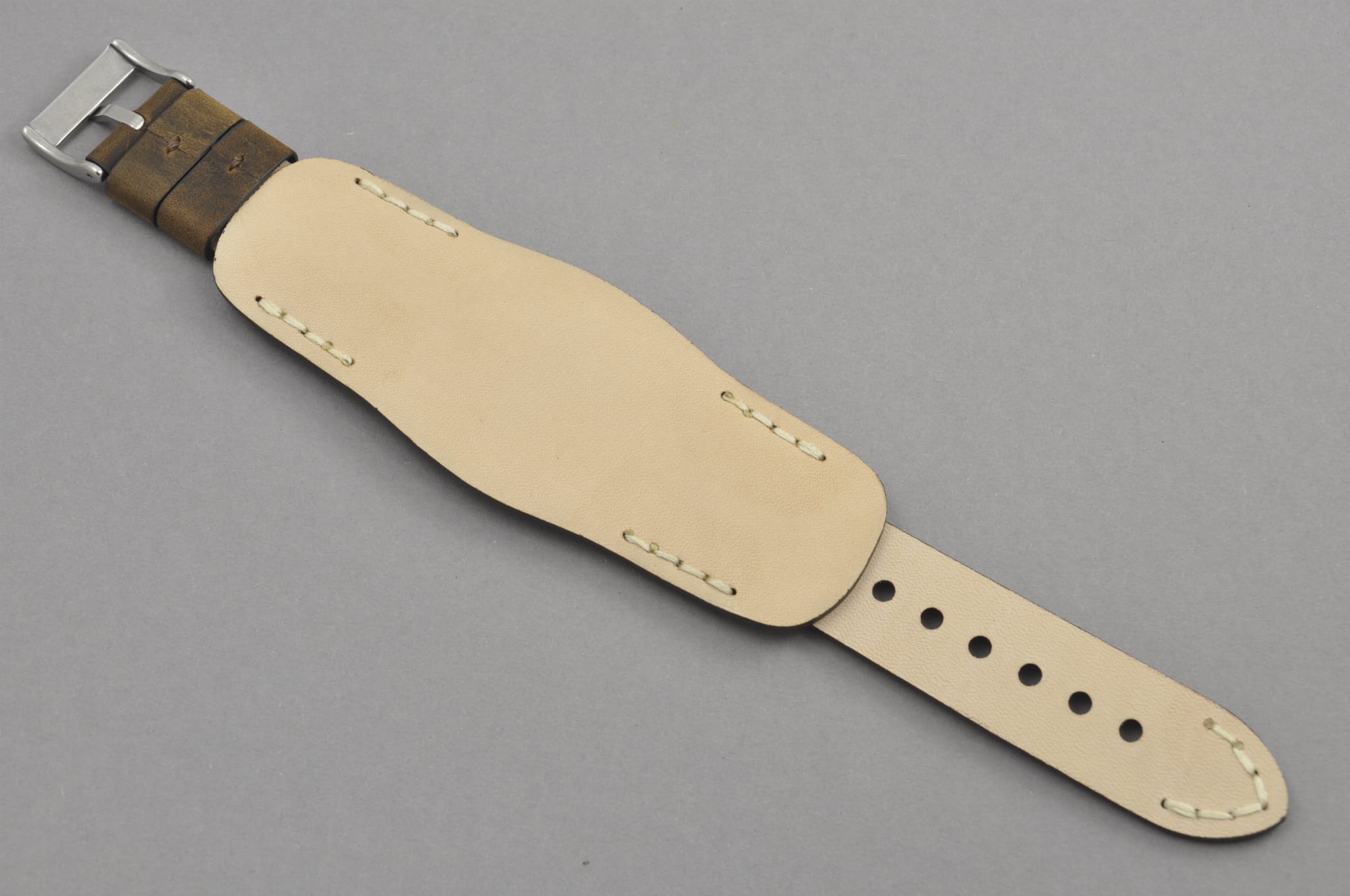 Trzyczęściowy pasek z podkładką, skórzany, klejony, gładki. Równoległy fason w stylu vintage, z kolorowymi przeszyciami: przy mocowaniu do zegarka, przy klamerce oraz na końcu części z dziurkami.Tym samym kolorem przeszyte uchwyty paska w podkładce.  Miękki, wykończenie matowe. Dwie szerokie ruchome szlufki, masywna stalowa klamerka.