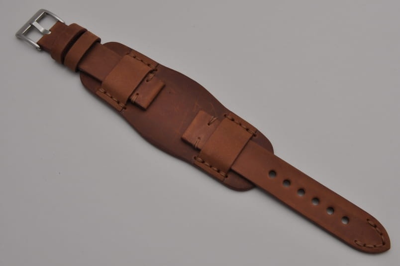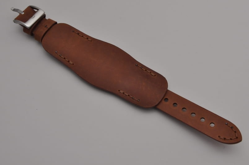 Trzyczęściowy pasek z podkładką, skórzany, klejony, gładki. Równoległy fason w stylu vintage, z kolorowymi przeszyciami: przy mocowaniu do zegarka, przy klamerce oraz na końcu części z dziurkami. Tym samym kolorem przeszyte uchwyty paska w podkładce. Miękki, wykończenie matowe. Dwie szerokie ruchome szlufki, masywna stalowa klamerka.