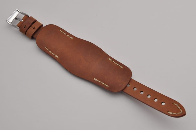 Trzyczęściowy pasek z podkładką, skórzany, klejony, gładki. Równoległy fason w stylu vintage, z kolorowymi przeszyciami: przy mocowaniu do zegarka, przy klamerce oraz na końcu części z dziurkami. Tym samym kolorem przeszyte uchwyty paska w podkładce. Miękki, wykończenie matowe. Dwie szerokie ruchome szlufki, masywna stalowa klamerka.