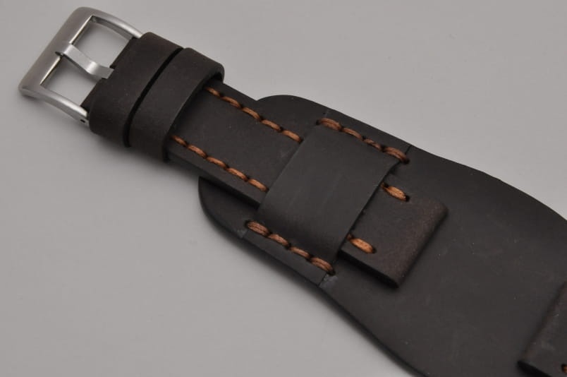 Trzyczęściowy pasek z podkładką, skórzany, klejony, gładki. Równoległy fason w stylu vintage, z kolorowymi przeszyciami na całej długości paska i przy klamerce. Tym samym kolorem przeszyte uchwyty paska w podkładce. Miękki, wykończenie matowe. Dwie szerokie ruchome szlufki, masywna stalowa klamerka.