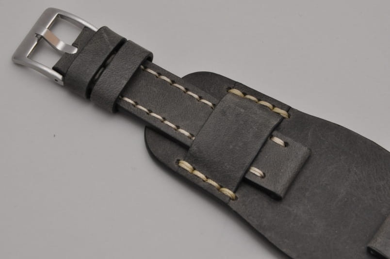 Trzyczęściowy pasek z podkładką, skórzany, klejony, gładki. Równoległy fason w stylu vintage, z kolorowymi przeszyciami na całej długości paska i przy klamerce. Tym samym kolorem przeszyte uchwyty paska w podkładce. Miękki, wykończenie matowe. Dwie szerokie ruchome szlufki, masywna stalowa klamerka.