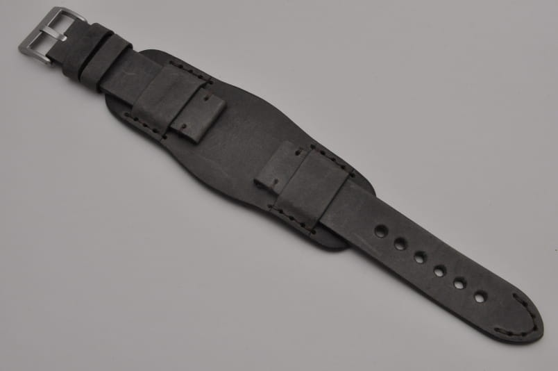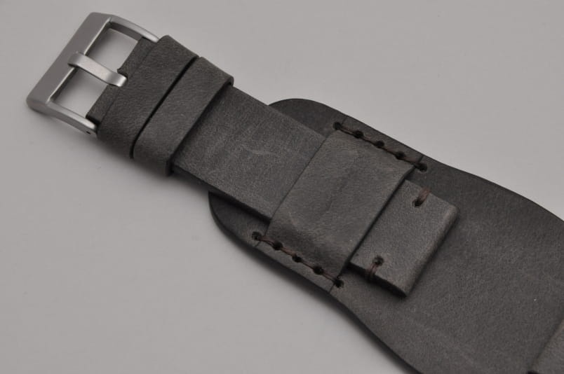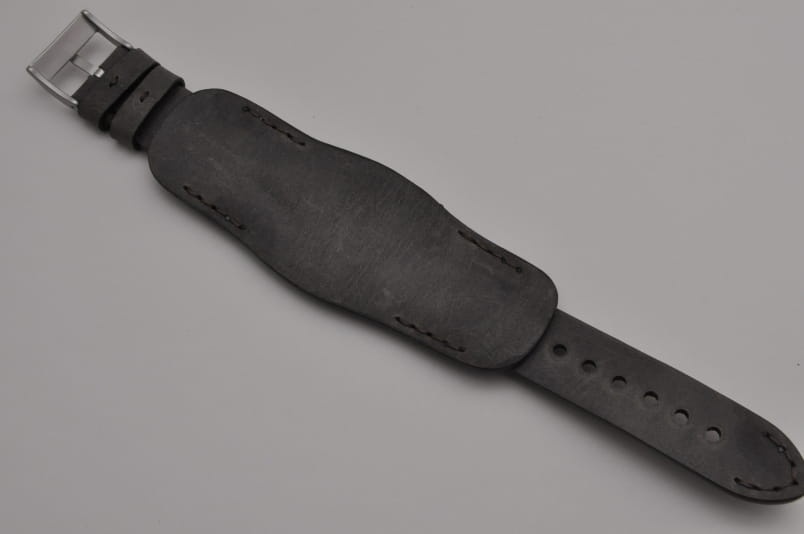 Trzyczęściowy pasek z podkładką, skórzany, klejony, gładki. Równoległy fason w stylu vintage, z kolorowymi przeszyciami: przy mocowaniu do zegarka, przy klamerce oraz na końcu części z dziurkami. Tym samym kolorem przeszyte uchwyty paska w podkładce. Miękki, wykończenie matowe. Dwie szerokie ruchome szlufki, masywna stalowa klamerka.