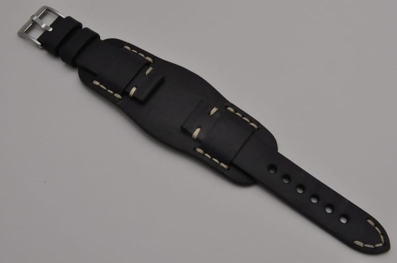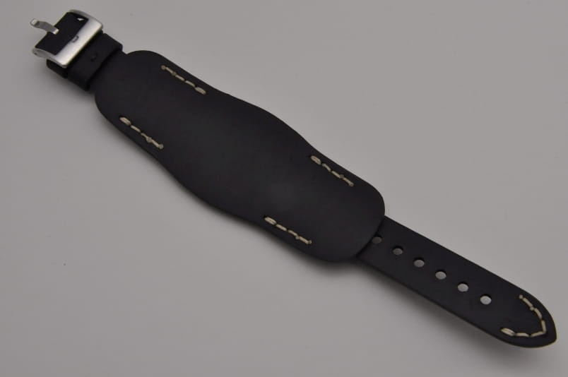 Trzyczęściowy pasek z podkładką, skórzany, klejony, gładki. Równoległy fason w stylu vintage, z kolorowymi przeszyciami: przy mocowaniu do zegarka, przy klamerce oraz na końcu części z dziurkami. Tym samym kolorem przeszyte uchwyty paska w podkładce. Miękki, wykończenie matowe. Dwie szerokie ruchome szlufki, masywna stalowa klamerka.
