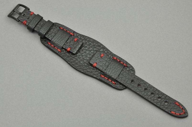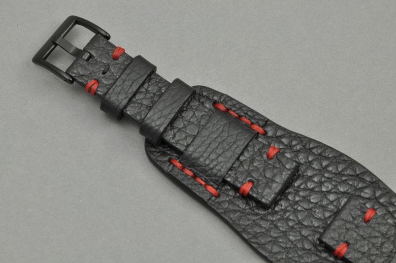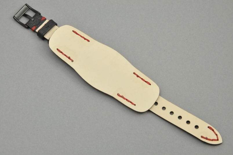 Trzyczęściowy pasek z podkładką, skórzany, klejony, z fakturą skóry byka. Równoległy fason w stylu vintage, z kolorowymi przeszyciami: przy mocowaniu do zegarka, przy klamerce oraz na końcu części z dziurkami.Tym samym kolorem przeszyte uchwyty paska w podkładce. Miękki, wykończenie matowe. Dwie szerokie ruchome szlufki, masywna stalowa klamerka.