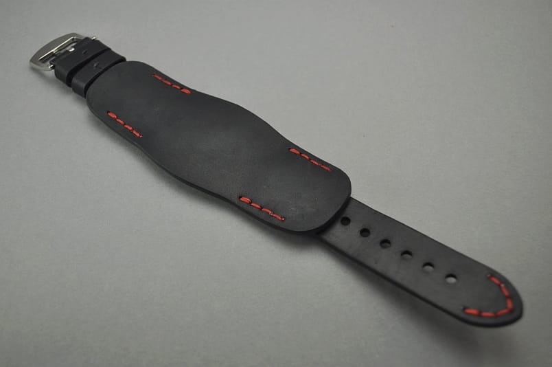 Trzyczęściowy pasek z podkładką, skórzany, klejony, gładki. Równoległy fason w stylu vintage, z kolorowymi przeszyciami: przy mocowaniu do zegarka, przy klamerce oraz na końcu części z dziurkami.Tym samym kolorem przeszyte uchwyty paska w podkładce. Miękki, wykończenie matowe. Dwie szerokie ruchome szlufki, masywna stalowa klamerka.