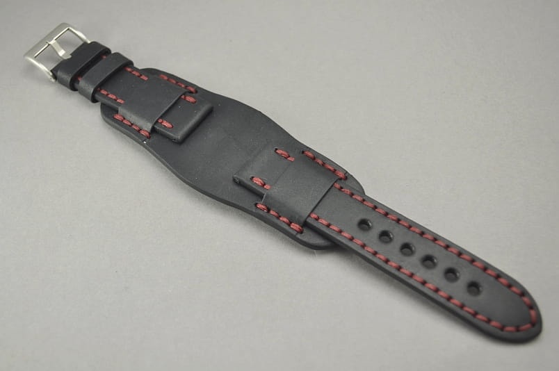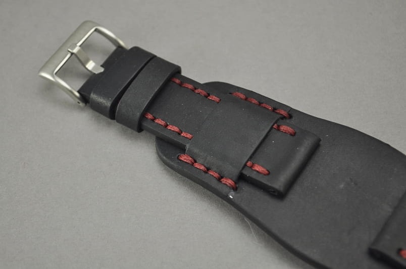 Trzyczęściowy pasek z podkładką, skórzany, klejony, gładki. Równoległy fason w stylu vintage, z kolorowymi przeszyciami na całej długości paska i przy klamerce .Tym samym kolorem przeszyte uchwyty paska w podkładce. Miękki, wykończenie matowe. Dwie szerokie ruchome szlufki, masywna stalowa klamerka.