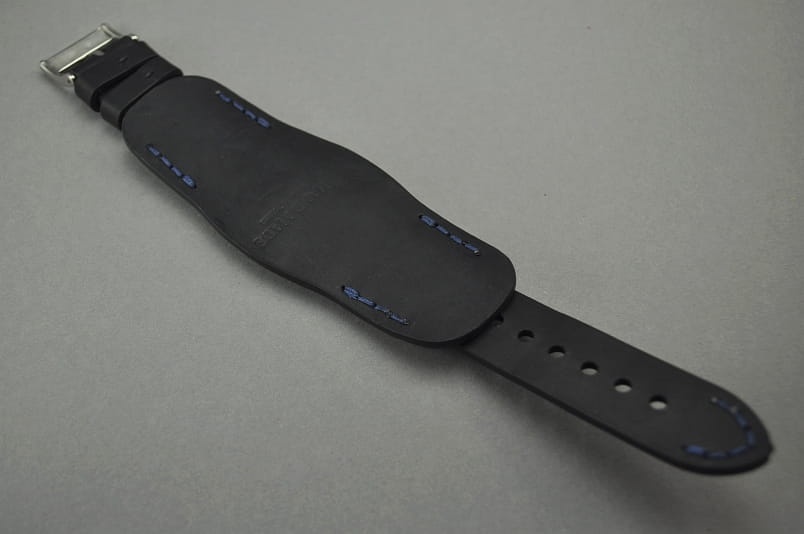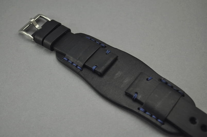 Trzyczęściowy pasek z podkładką, skórzany, klejony, gładki. Równoległy fason w stylu vintage, z kolorowymi przeszyciami: przy mocowaniu do zegarka, przy klamerce oraz na końcu części z dziurkami.Tym samym kolorem przeszyte uchwyty paska w podkładce. Miękki, wykończenie matowe. Dwie szerokie ruchome szlufki, masywna stalowa klamerka.