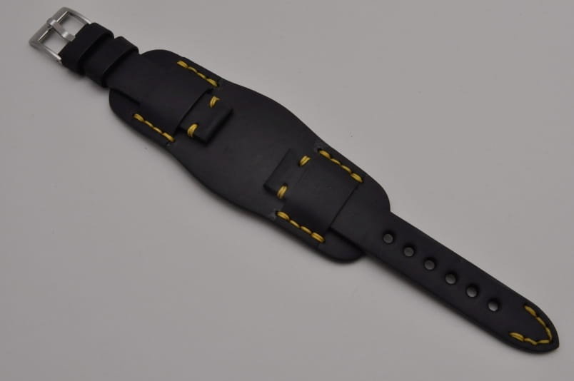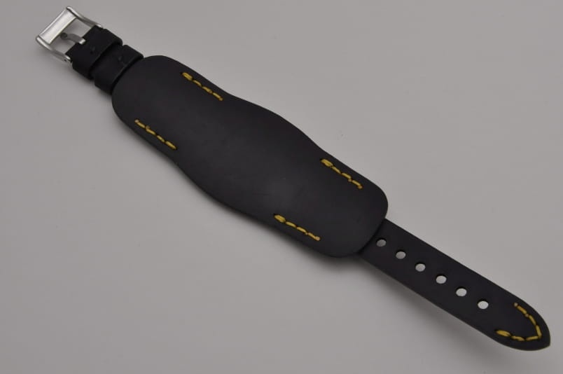 Trzyczęściowy pasek z podkładką, skórzany, klejony, gładki. Równoległy fason w stylu vintage, z kolorowymi przeszyciami: przy mocowaniu do zegarka, przy klamerce oraz na końcu części z dziurkami. Tym samym kolorem przeszyte uchwyty paska w podkładce. Miękki, wykończenie matowe. Dwie szerokie ruchome szlufki, masywna stalowa klamerka.