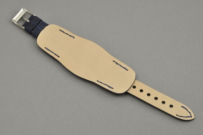 Trzyczęściowy pasek z podkładką, skórzany, klejony, gładki. Równoległy fason w stylu vintage, z kolorowymi przeszyciami: przy mocowaniu do zegarka, przy klamerce oraz na końcu części z dziurkami.Tym samym kolorem przeszyte uchwyty paska w podkładce.  Miękki, wykończenie matowe. Dwie szerokie ruchome szlufki, masywna stalowa klamerka.