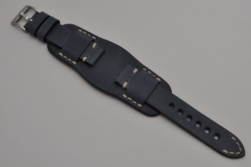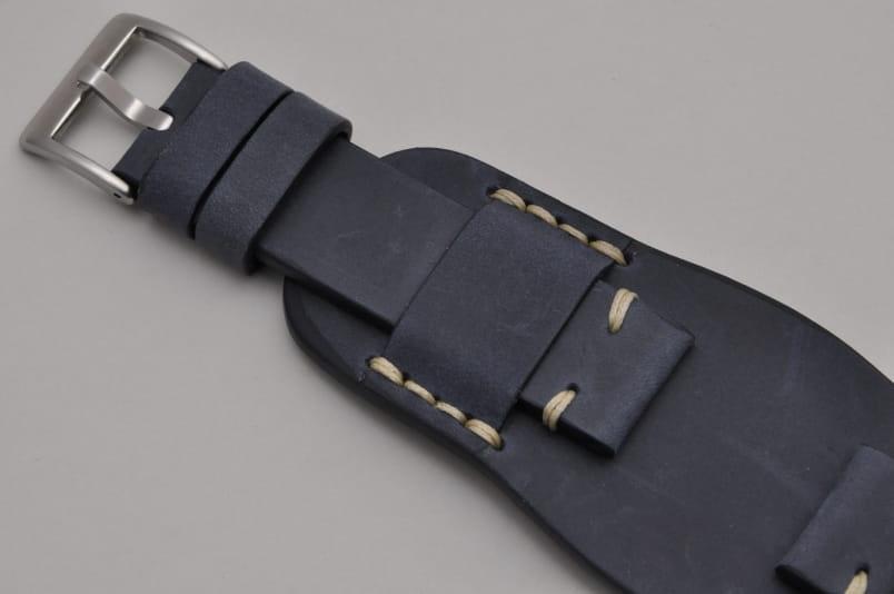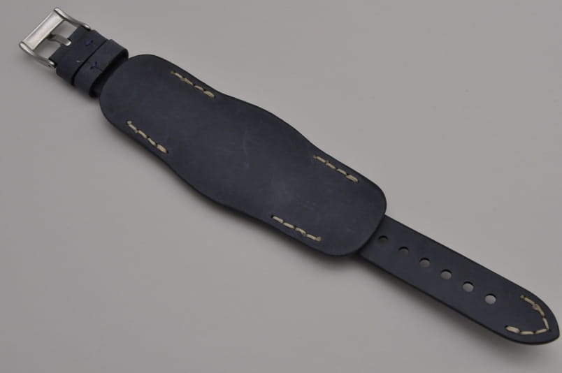 Trzyczęściowy pasek z podkładką, skórzany, klejony, gładki. Równoległy fason w stylu vintage, z kolorowymi przeszyciami: przy mocowaniu do zegarka, przy klamerce oraz na końcu części z dziurkami. Tym samym kolorem przeszyte uchwyty paska w podkładce. Miękki, wykończenie matowe. Dwie szerokie ruchome szlufki, masywna stalowa klamerka.