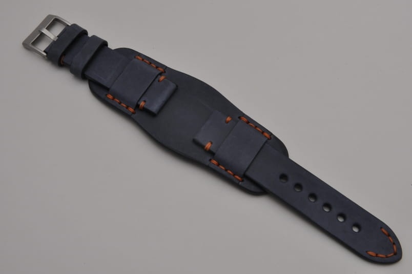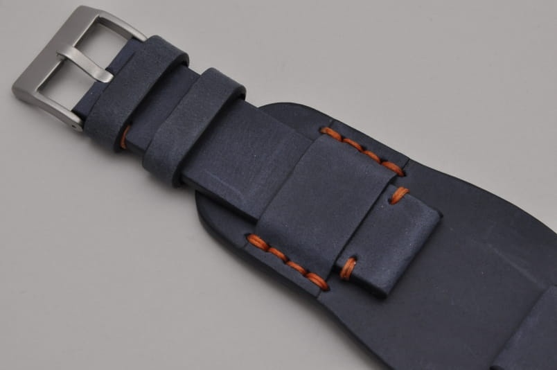 Trzyczęściowy pasek z podkładką, skórzany, klejony, gładki. Równoległy fason w stylu vintage, z kolorowymi przeszyciami: przy mocowaniu do zegarka, przy klamerce oraz na końcu części z dziurkami. Tym samym kolorem przeszyte uchwyty paska w podkładce. Miękki, wykończenie matowe. Dwie szerokie ruchome szlufki, masywna stalowa klamerka.