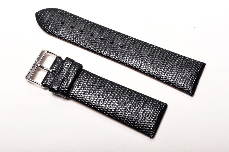 Wykonany z naturalnej skóry cielęcej. Klejony, płaski pasek bez szwów. Imitacja skóry jaszczurki. Grubość 3,2mm, ładnie układa się na ręku. Stalowa klamerka z logo, podwójna szlufka.