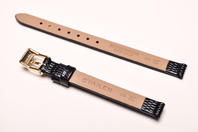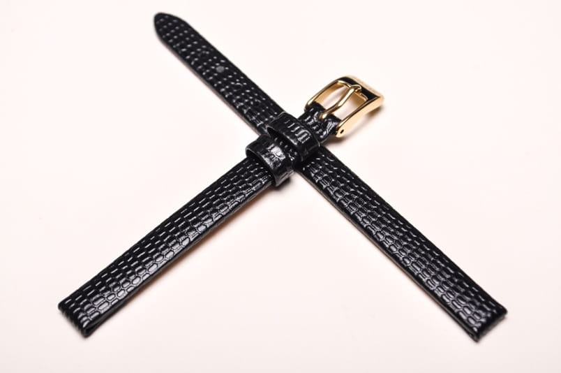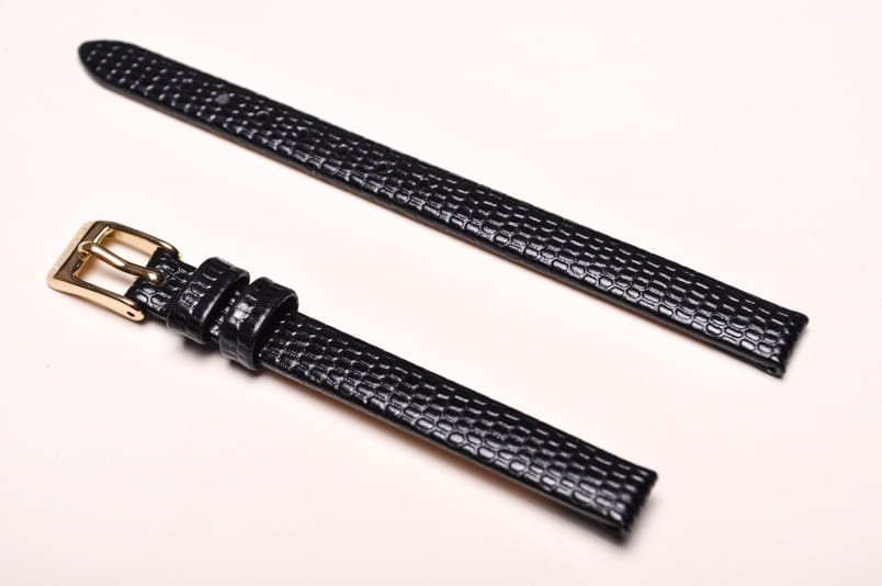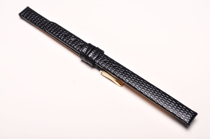 Wykonany z naturalnej skóry cielęcej. Klejony, płaski pasek bez szwów. Imitacja skóry jaszczurki. Miękki, grubość 2,7mm, ładnie układa się na ręku. Stalowa klamerka z logo, podwójna szlufka.
