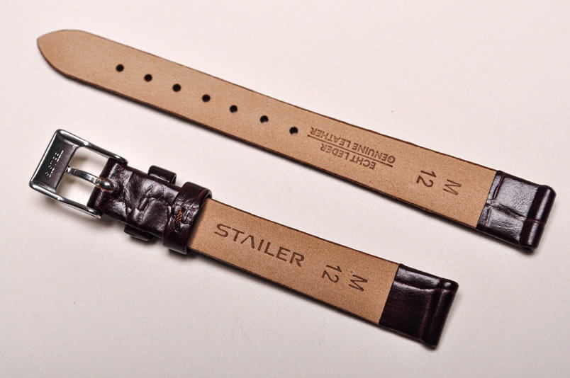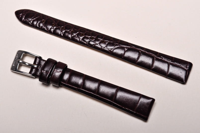 Wykonany ze skóry cielęcej, klejony, imitacja skóry aligatora. Miękki i błyszczący. Grubość ok. 3,0mm. Dwie szlufki, stalowa klamerka.