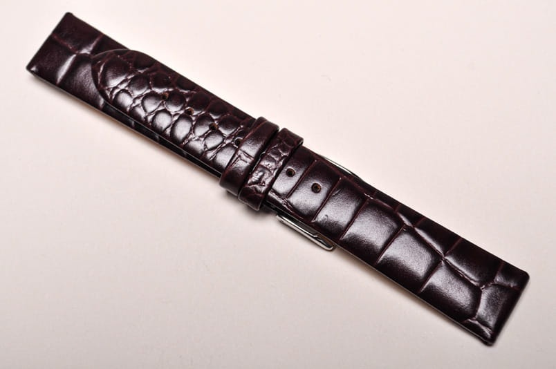 Wykonany ze skóry cielęcej, klejony, imitacja skóry aligatora. Miękki i błyszczący. Grubość przy mocowaniu 4,0mm, na końcu 3,0mm. Dwie szlufki, stalowa klamerka.
