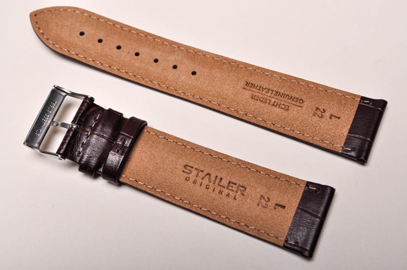 Wykonany ze skóry cielęcej, imitacja skóry aligatora. Miękki, matowy, przeszyty nicią pod kolor. Grubość ok. 2,5mm.