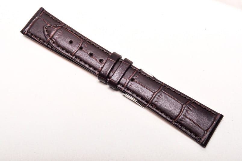 Wykonany ze skóry cielęcej, imitacja skóry aligatora. Miękki, matowy, przeszyty nicią pod kolor. Grubość przy mocowaniu 3,5mm, na końcu 2,5mm. Dwie szlufki, stalowa klamerka.