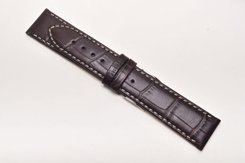 Wykonany ze skóry cielęcej, imitacja skóry aligatora. Miękki, matowy, przeszyty białą nicią. Grubość przy mocowaniu 3,5mm, na końcu 2,5mm.