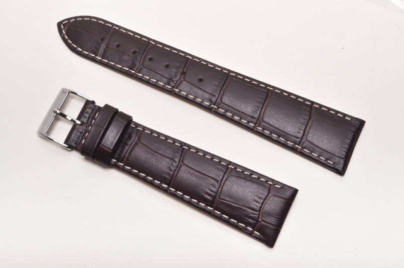 Wykonany ze skóry cielęcej, imitacja skóry aligatora. Miękki, przeszyty białą nicią. Grubość przy mocowaniu 3,5mm, na końcu 2,5mm.