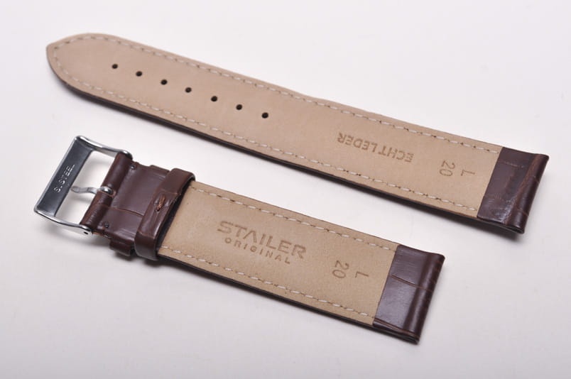 Wykonany ze skóry cielęcej, imitacja skóry aligatora. Miękki, matowy, przeszyty nicią pod kolor. Grubość przy mocowaniu 4,5mm, na końcu 3,2mm. Dwie szlufki, stalowa klamerka. Równoległy fason. Wersja XL