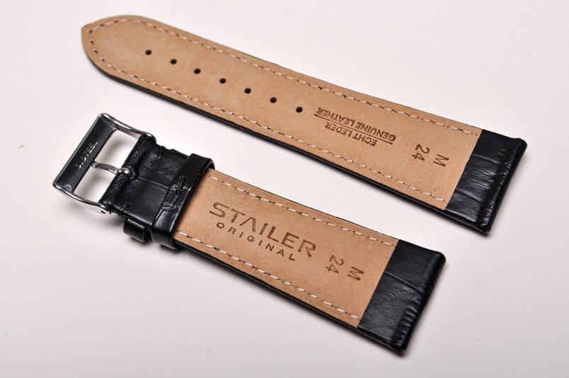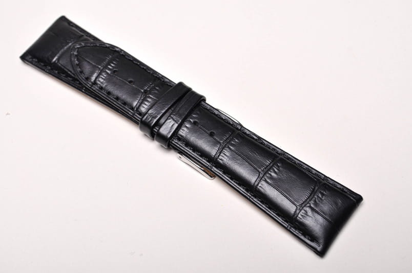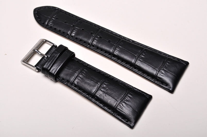 Wykonany ze skóry cielęcej, imitacja skóry aligatora. Wykończenie w półpołysku, przeszyty nicią pod kolor. Grubość przy mocowaniu 5,00mm, na końcu 3,2mm. Dwie szlufki, stalowa klamerka.