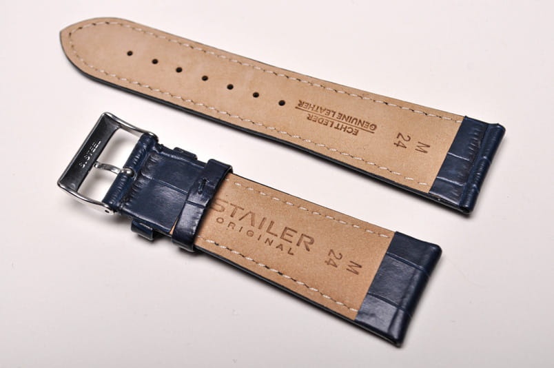 Wykonany ze skóry cielęcej, imitacja skóry aligatora. Wykończenie w półpołysku, przeszyty nicią pod kolor. Grubość przy mocowaniu 4,00mm, na końcu 2,7mm. Dwie szlufki, stalowa klamerka.