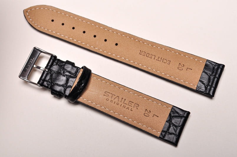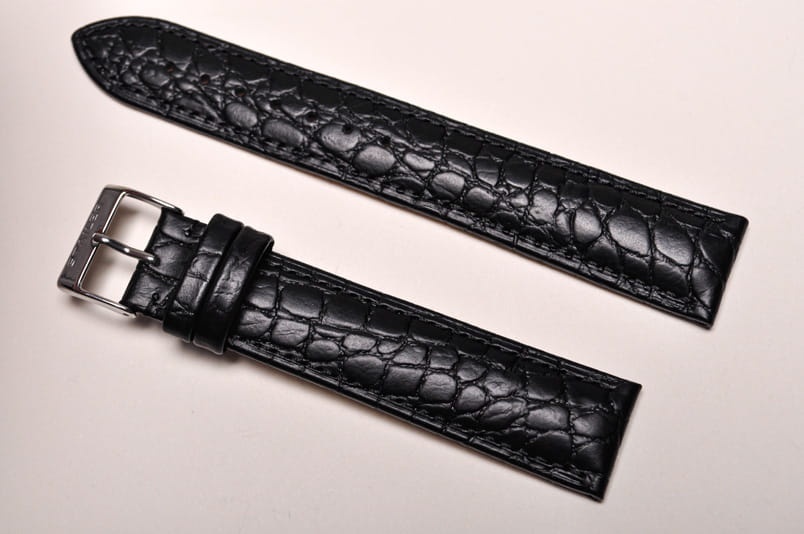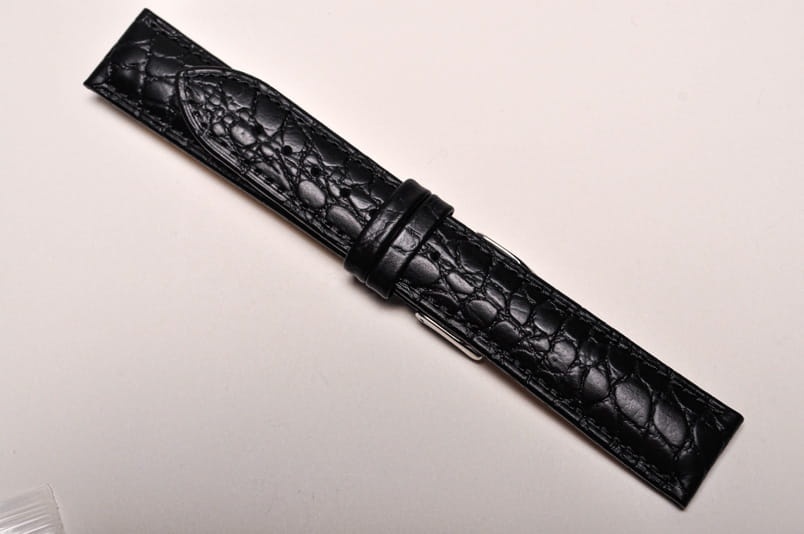 Wykonany ze skóry cielęcej, imitacja skóry krokodyla. Miękki, matowy, przeszyty nicią pod kolor. Grubość przy mocowaniu 5,00mm, na końcu 3,0mm. Dwie szlufki, stalowa klamerka. Wersja XL.
