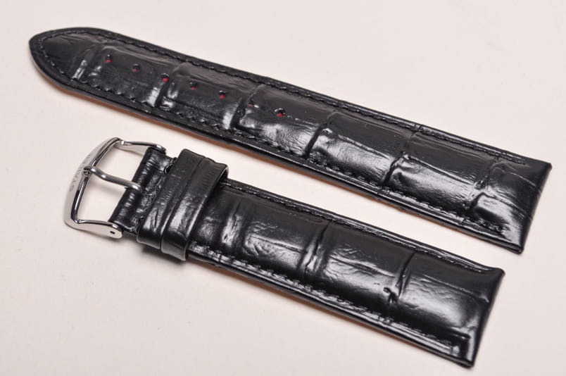 Wykonany ze skóry cielęcej tłoczonej na wzór aligatora. Przeszyty nicią pod kolor paska. Widocznie pogrubiany do 5mm. Licowa, perforowana futrówka. Dwie szlufki, stalowa klamerka.