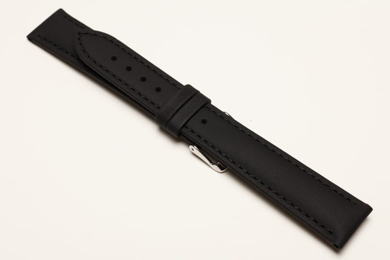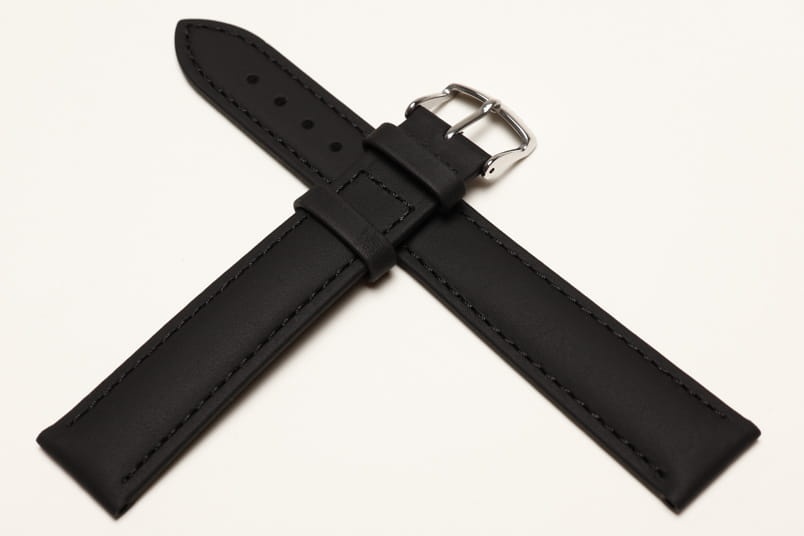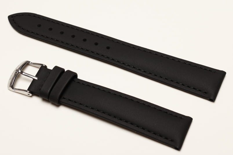 Gładki, matowy pasek wykonany ze skóry o podwyższonej odporności na wodę. Przeszyty czarną nicią. Lekko pogrubiany. Dwie szlufki, stalowa klamerka.