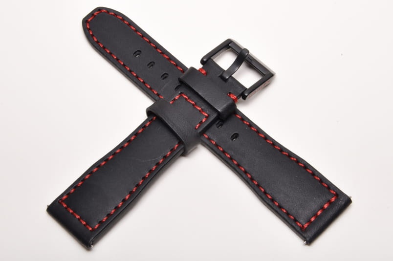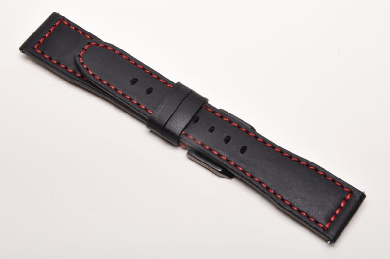 Wykonany ze skóry cielęcej w wyprawie roślinnej, czarna futrówka. Przeszyty czerwoną nicią. Pogrubiany na całej długości do 3,7mm. Dwie szlufki, stalowa klamerka. Wbudowane szybkie teleskopy.
